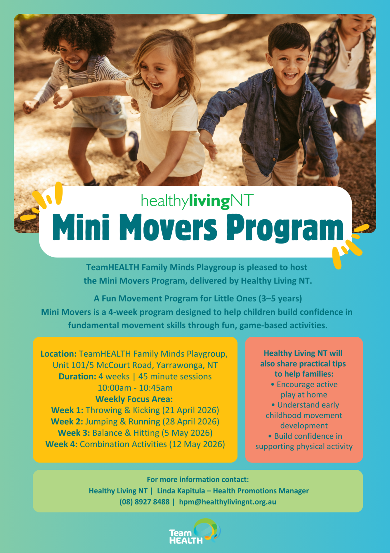 A Fun Movement Program for Little Ones (3-5 years). Mini Movers is a 4-week program designed to help children build confidence in fundamental movement skills through fun, game-based activities.